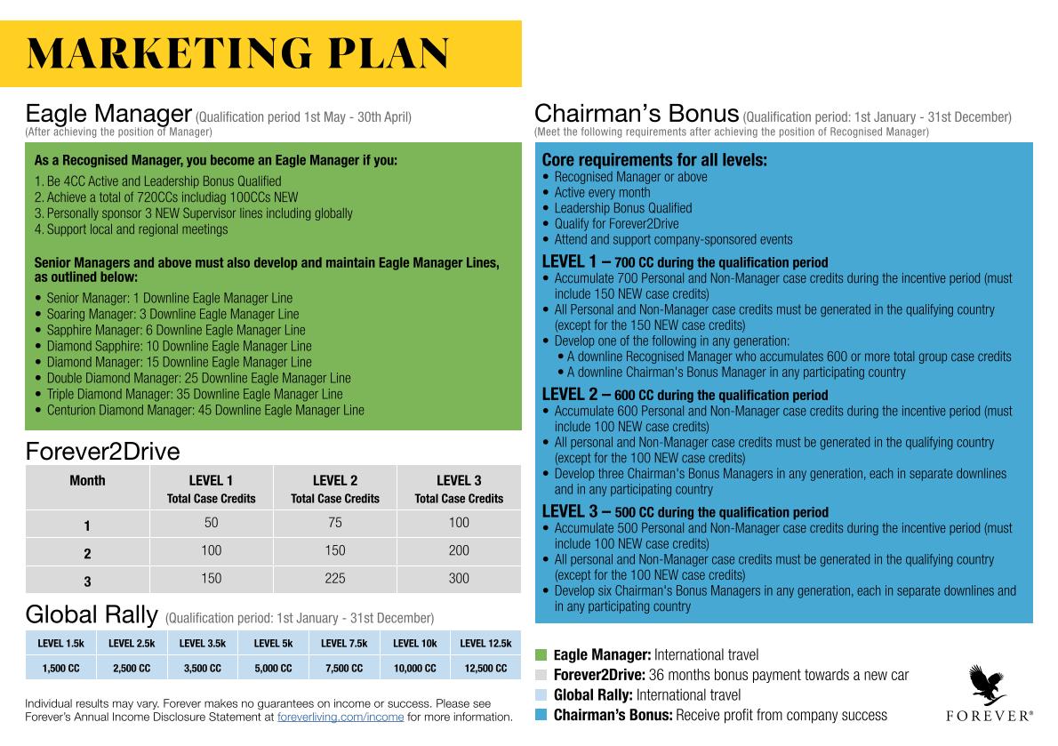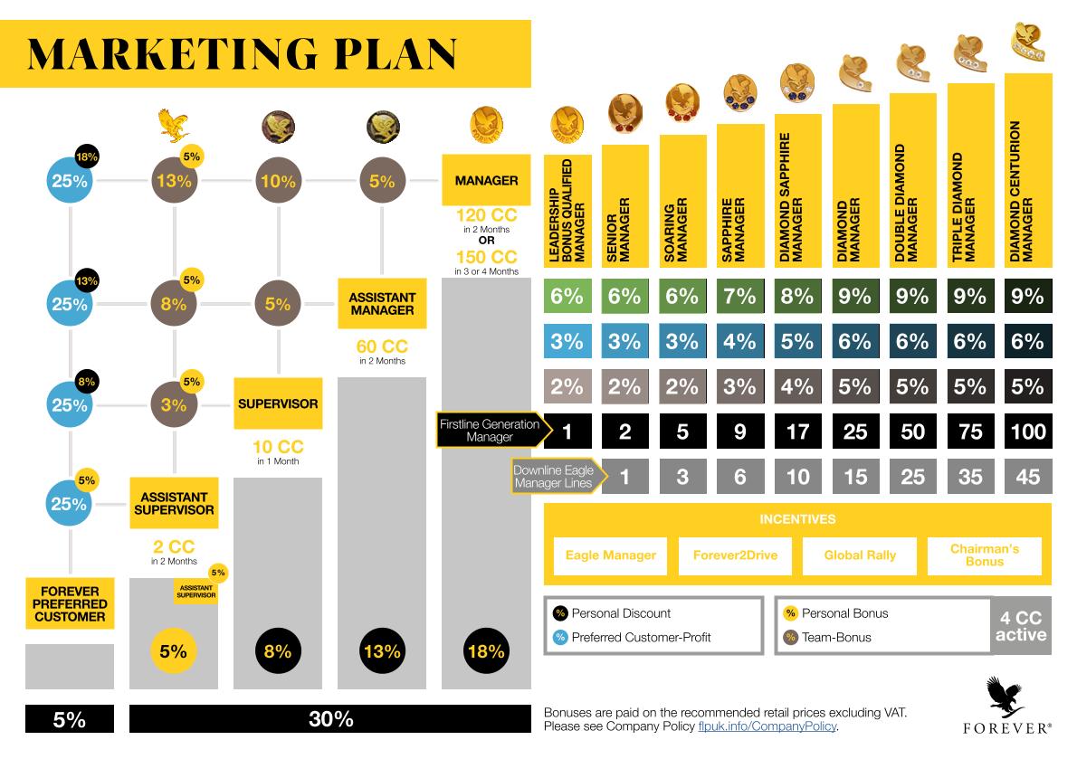 The Forever Marketing Plan provides you with a clear route to growing your business into a successful venture and underpins the incentives on offer. As you develop your business, build a team and increase sales, you move up the Marketing Plan and progress through the incentives. With Forever, it really is that simple.